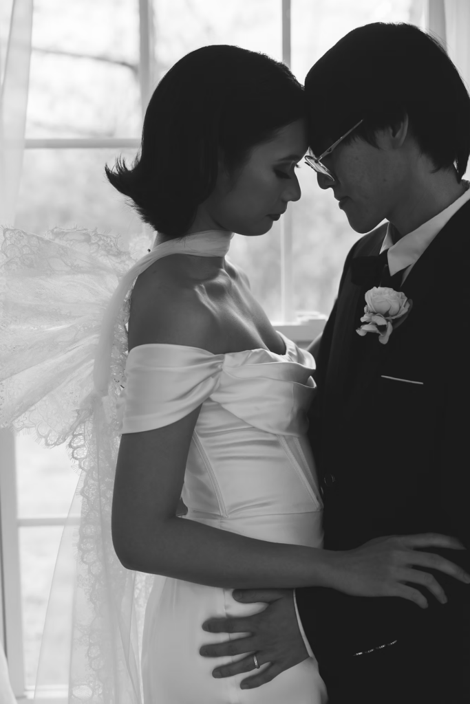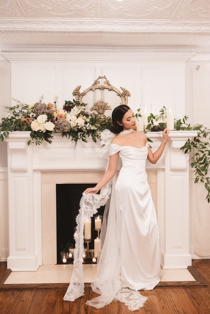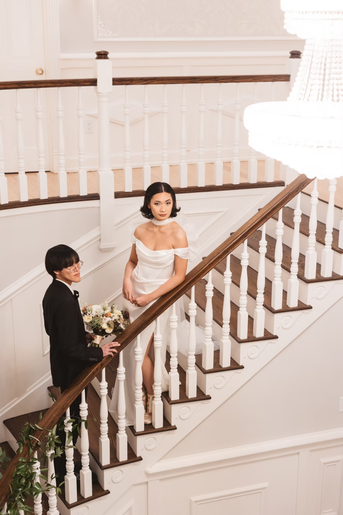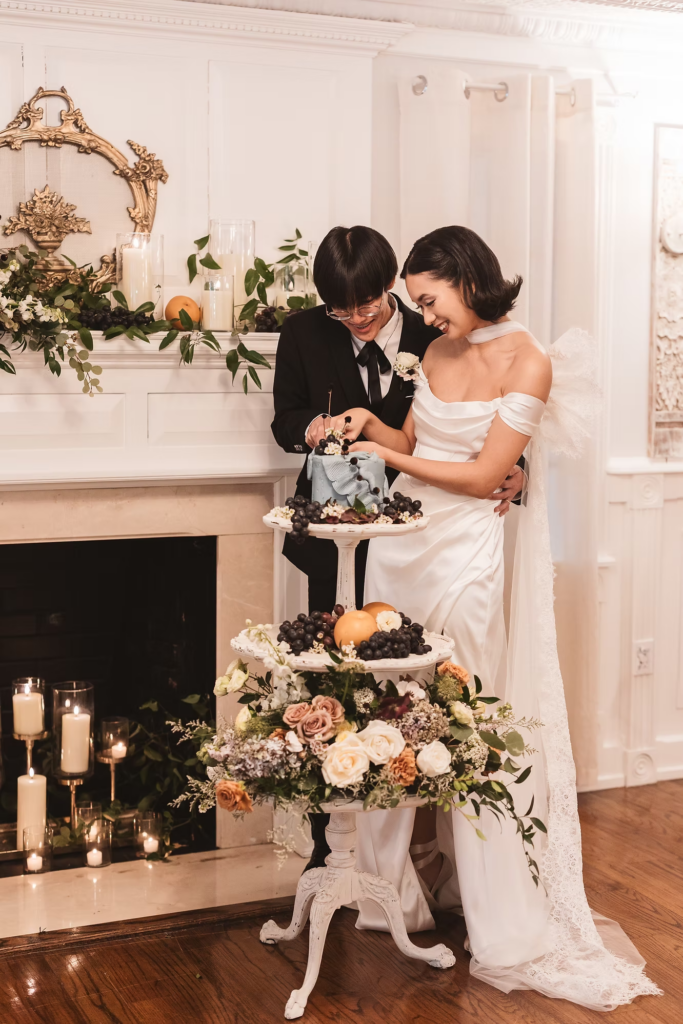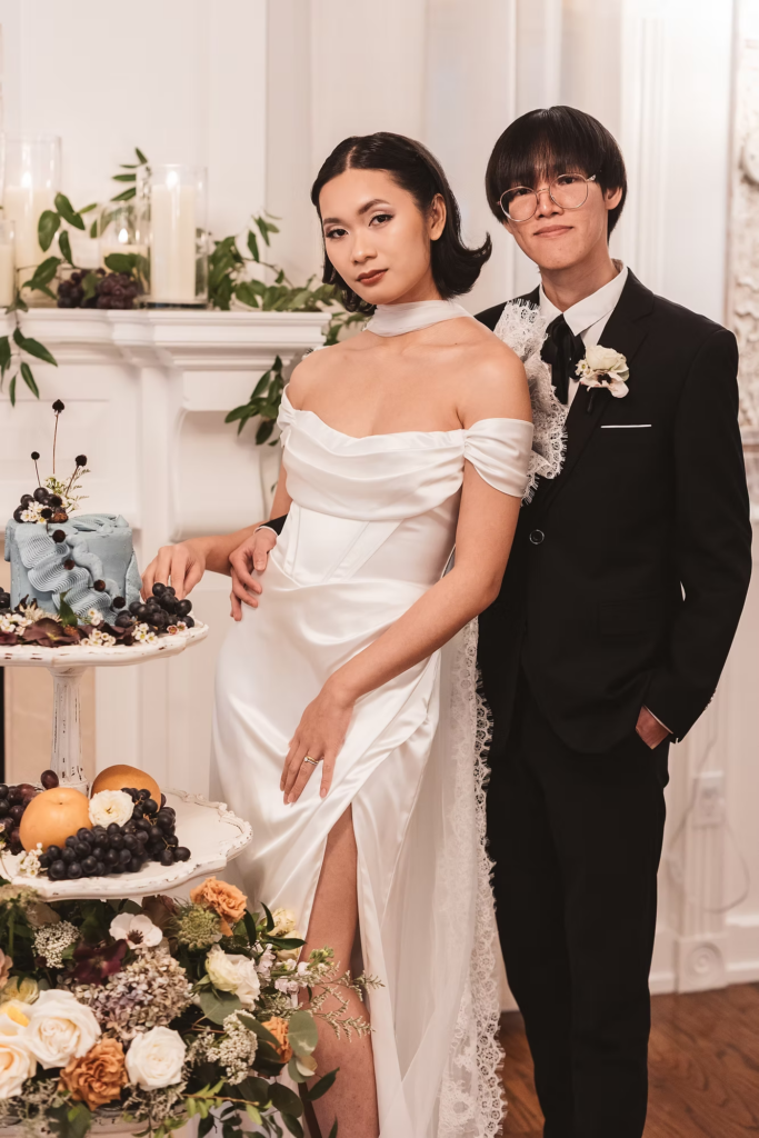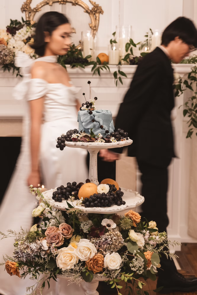 For the details, we opted for a cooler color palette to complement the overall feel of the Manor, and pulled it all together with the help of some wonderful local vendors. An angel wings scarf by Madison Chamberlain and fun blue cake by Cakes N’ Bakes are a few contributions that brought the vision to life. Florals and fruit were provided by Michelle herself, who doubles as venue owner and florist. Models Anna and Phyo were just perfect for creating these dreamy wedding portraits.