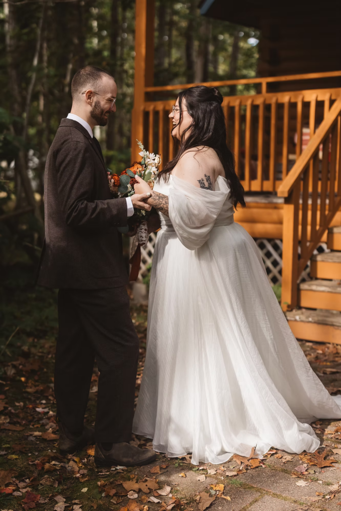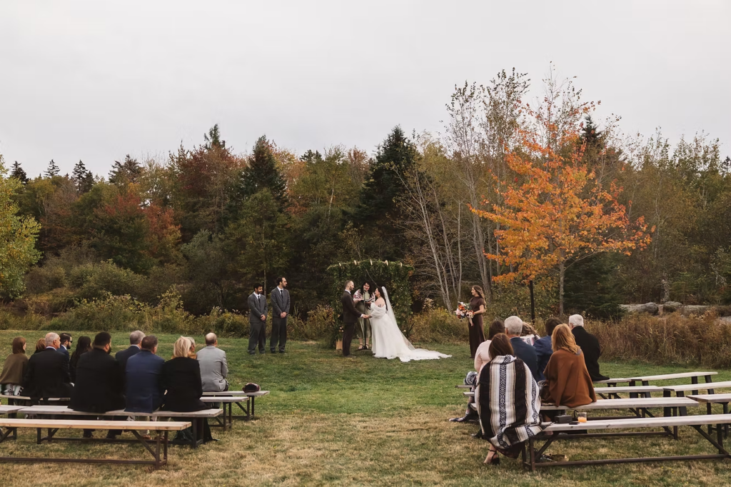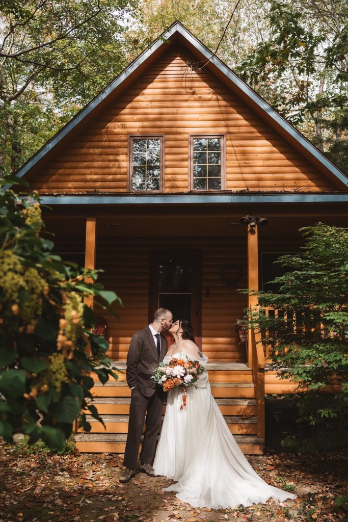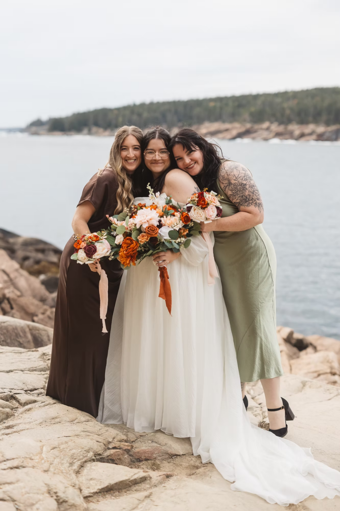 The wedding day was stunning from the start. A crisp October morning in a quaint Bar Harbor cabin complete with good coffee and good company. My husband, Dave tagged along as my assistant for this wedding which just made the day extra special. Sahvannah and Nick kept things simple, getting ready in the same house, with an impromptu first look on the front porch. From there, we passed around walkie talkies, one for each car, and headed out for Acadia National Park. We chose Gorham Trail, Otter Point, and Jordan Pond as our photo locations. Gorham Trail and Otter Point provided the most gorgeous views of Acadia’s iconic coast line that blends rocky terrain, tall trees, blue waters, and plenty of seagulls flying overhead. After passing through crowds of congratulatory hikers enjoying pop overs and prosecco on the lawn, Jordan Pond provided a calm and secluded atmosphere for Sahvannah and Nick to exchange their private vows. After all of that goodness, our day was just getting started, so we grabbed some coffees from Jordan Pond house and made our way into Bar Harbor for the main event.